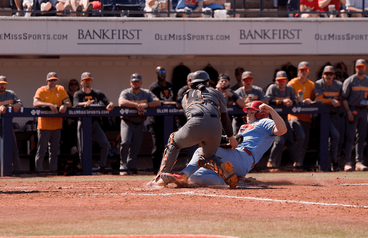 Tennessee played putrid defense in the series rubber match, committing four error and making a number of other mistakes as a four-run lead turned into a one-run deficit entering the ninth inning. But right fielder Reese Chapman played hero, hitting a go-ahead two-run homer to give Tennessee a ninth inning lead.