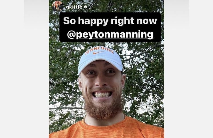 After Tennessee’s 35-point win over Iowa in Orlando, Kittle posted a picture to social media while wearing a bright orange Nike Tennessee shirt and a white Tennessee hat with the caption, “So happy right now,” while tagging Peyton Manning.