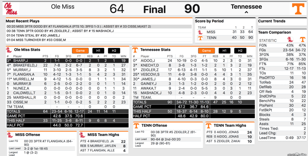 He hit one-of-two before Josiah-Jordan James raced up the court finding Mashack on the left wing. He pump faked and drilled a three-pointer as the first half expired. Tennessee finished the half on an 11-6 run in 2:06 which gave the Vols a nine-point halftime advantage.