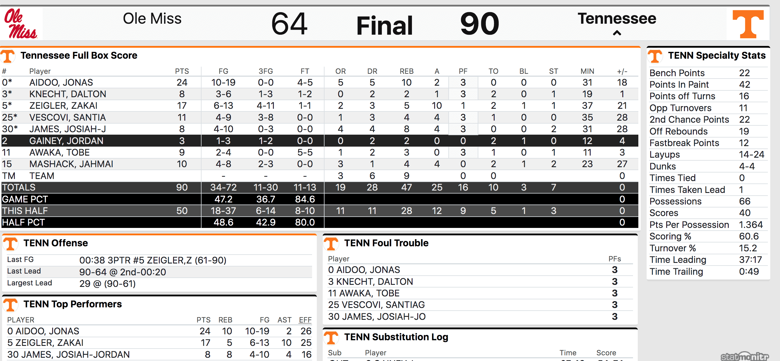 He hit one-of-two before Josiah-Jordan James raced up the court finding Mashack on the left wing. He pump faked and drilled a three-pointer as the first half expired. Tennessee finished the half on an 11-6 run in 2:06 which gave the Vols a nine-point halftime advantage.