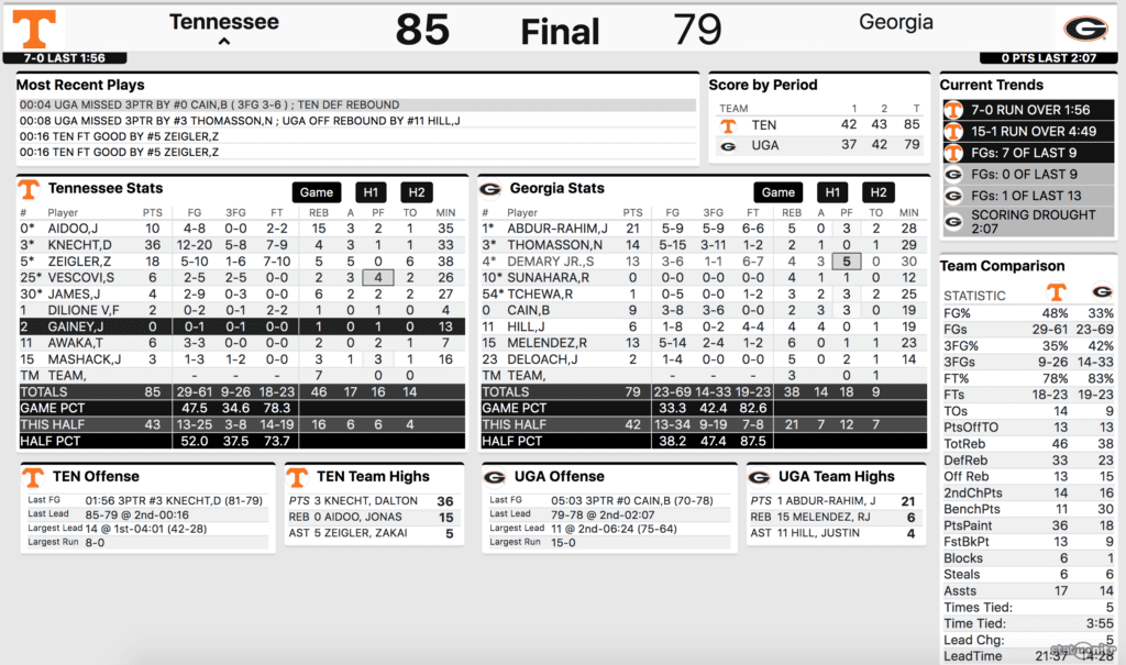 ATHENS, Ga. — Tennessee basketball led by 14 points in the first half and trailed by 11 points in second half before storming back to defeat the Bulldogs 85-79 at Stegeman Coliseum in Athens.