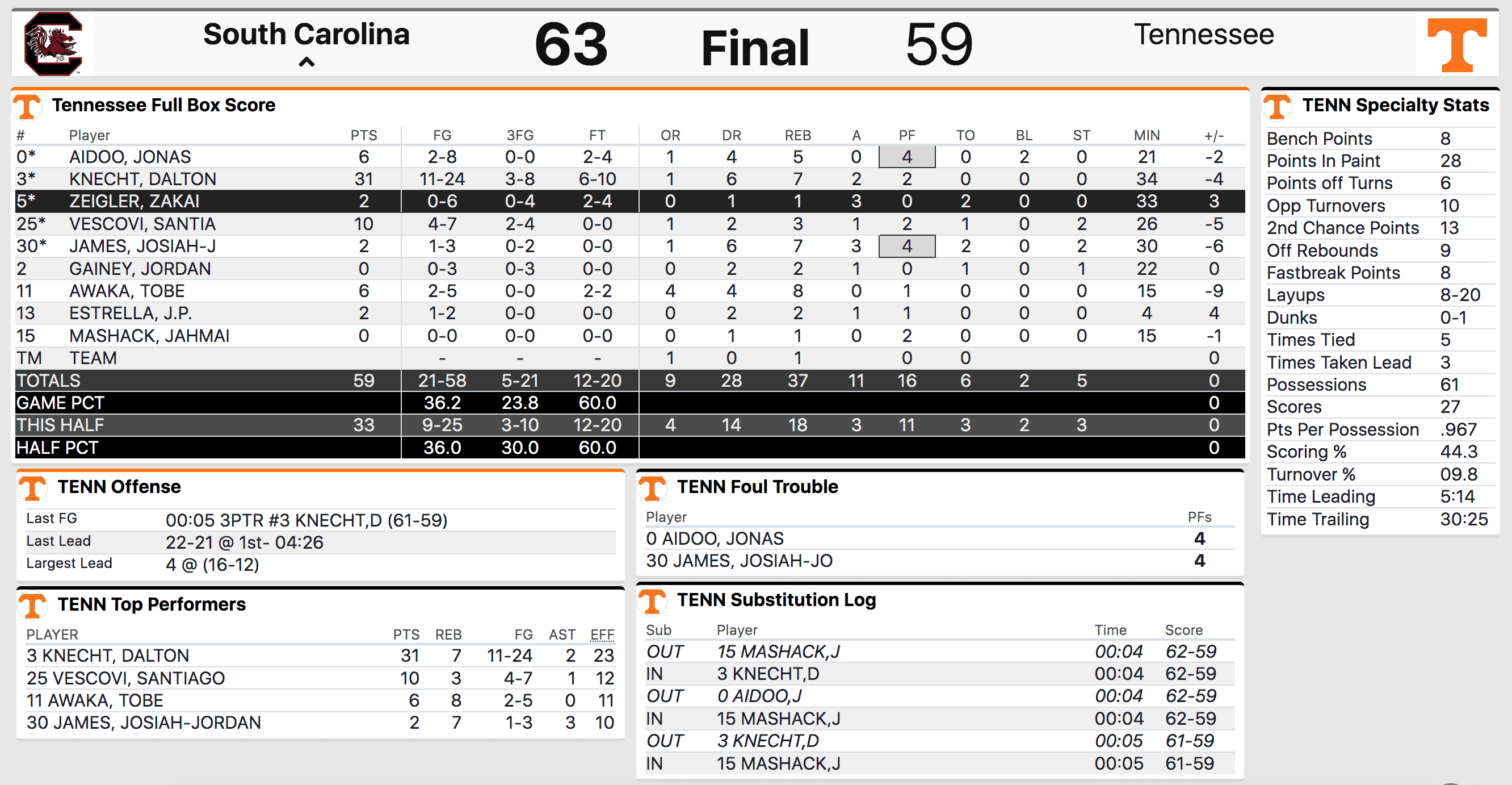 All in all, Tennessee was fortunate to enter the halftime break only down 30-26 due to the sloppy play on both ends of the court.