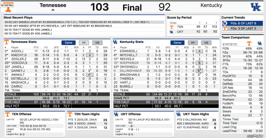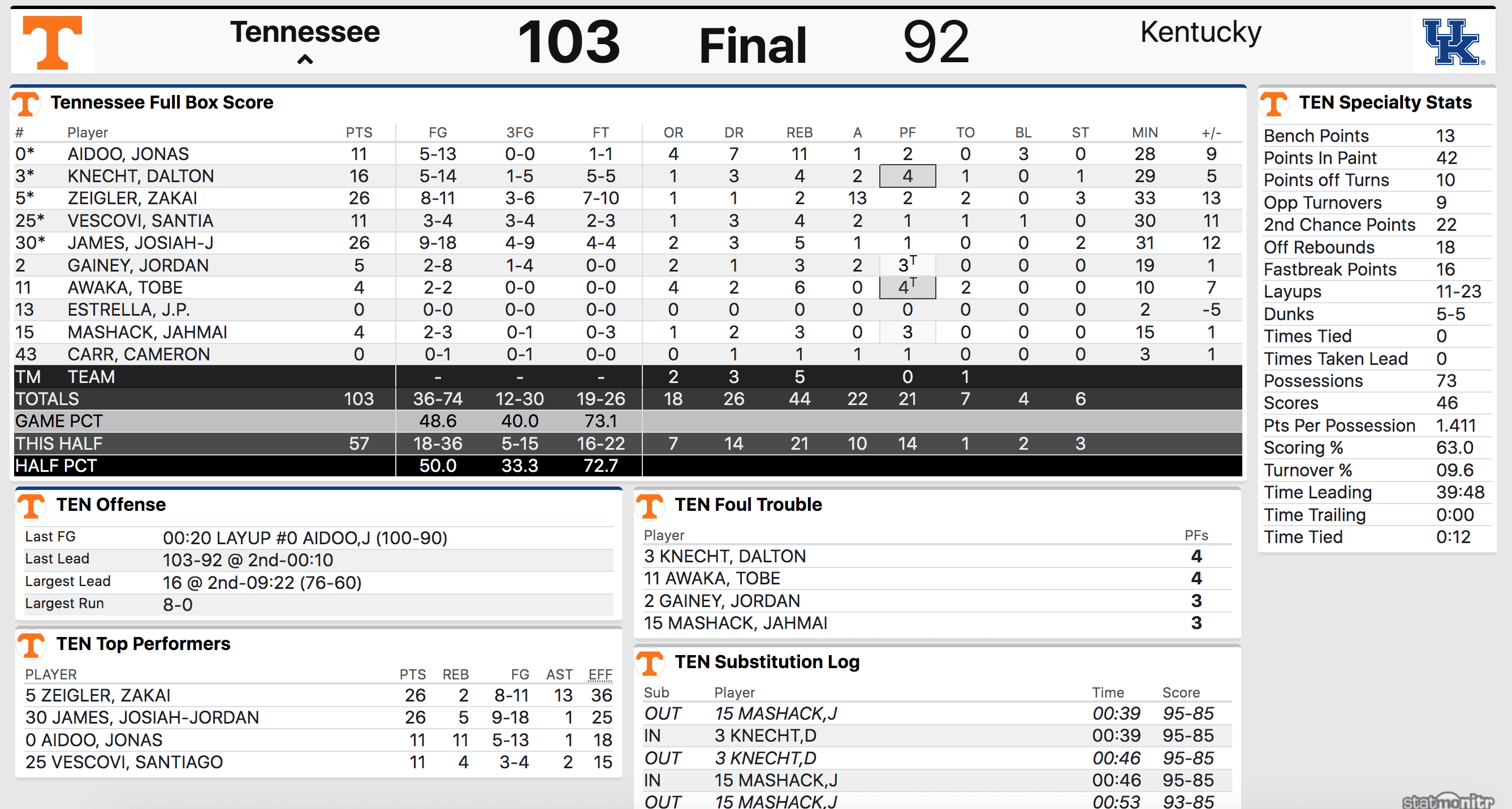 Zeigler drilled a three on the game’s opening possession and was off-and-running from there. The Tennessee point guard was fantastic at Rupp Arena and particularly in the first half when he made all five shots he attempted to post 13 points and four assists.