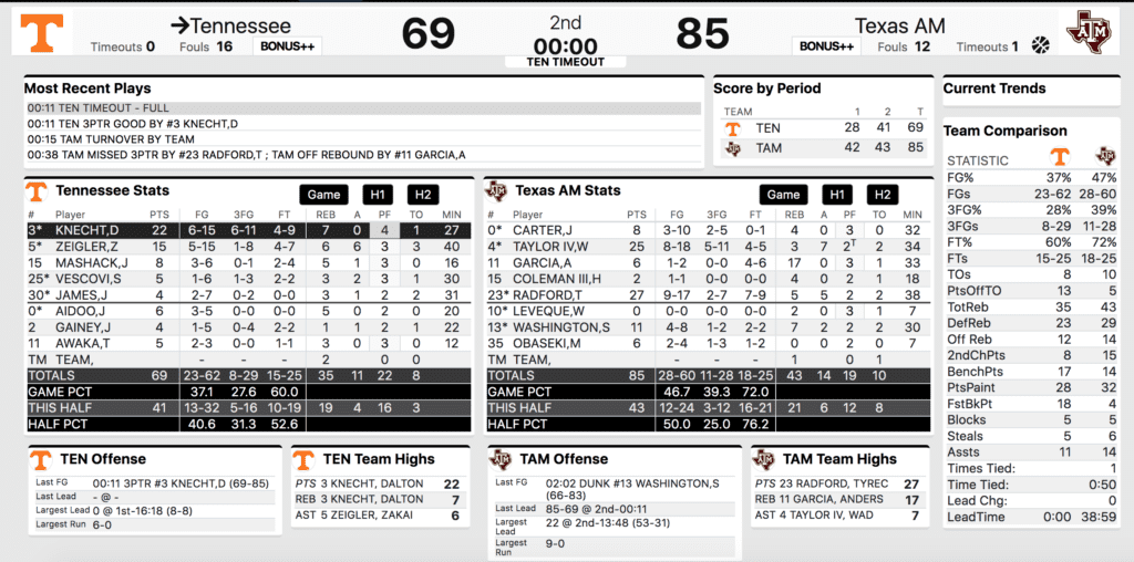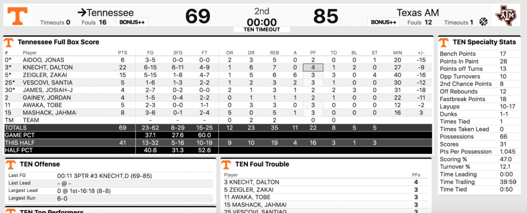 Tennessee’s real issue came when the Aggies stopped making perimeter jumpers and they were unable to make a run to close the first half, going into the locker room with the same 14-point deficit.