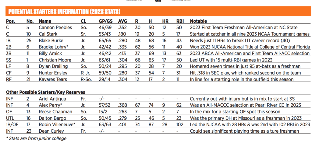 *Tennessee’s game notes didn’t include DH. Peebles, Dalton Bargo and Robin Villeneuve are the most likely options there