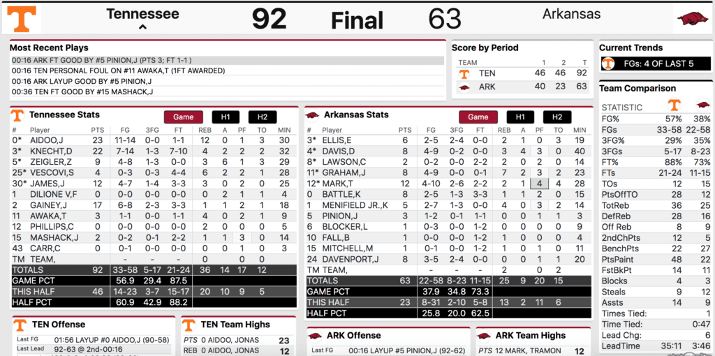 The Vols ran a play that got Knecht an open layup out of halftime and the onslaught was on. Zakai Zeigler hit a triple a possession late and Tennessee pushed its lead to 12 points by the first media timeout. After an Arkansas triple out of the timeout, the Vols went on an onslaught run.