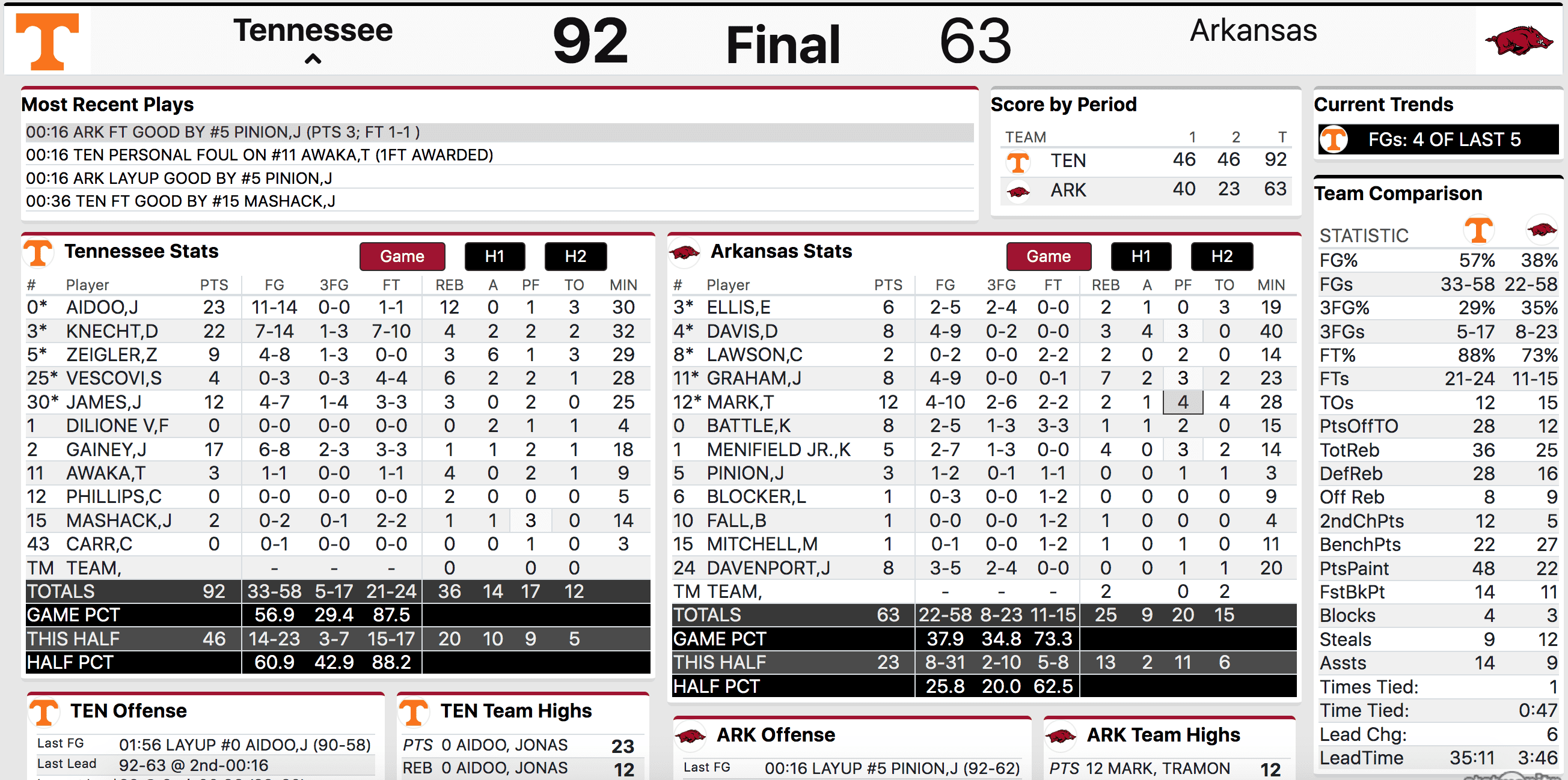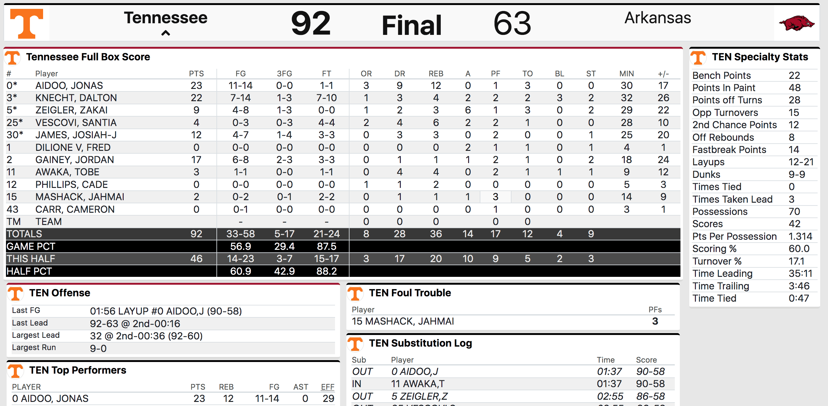 Knecht and Aidoo were the two main guys on the offensive end for Tennessee as well as Jordan Gainey who was effective on the defensive end.