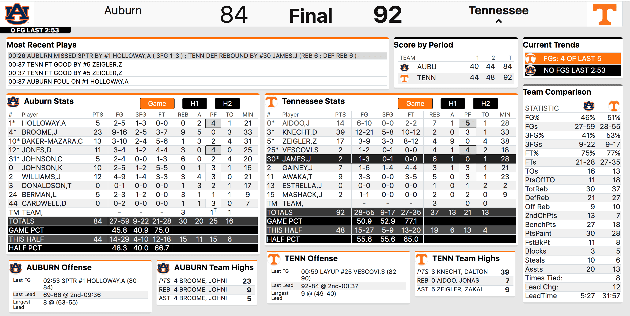 Tennessee took a four-point lead into halftime and quickly scored the first five points of the game to take a nine-point lead— its biggest of the game.