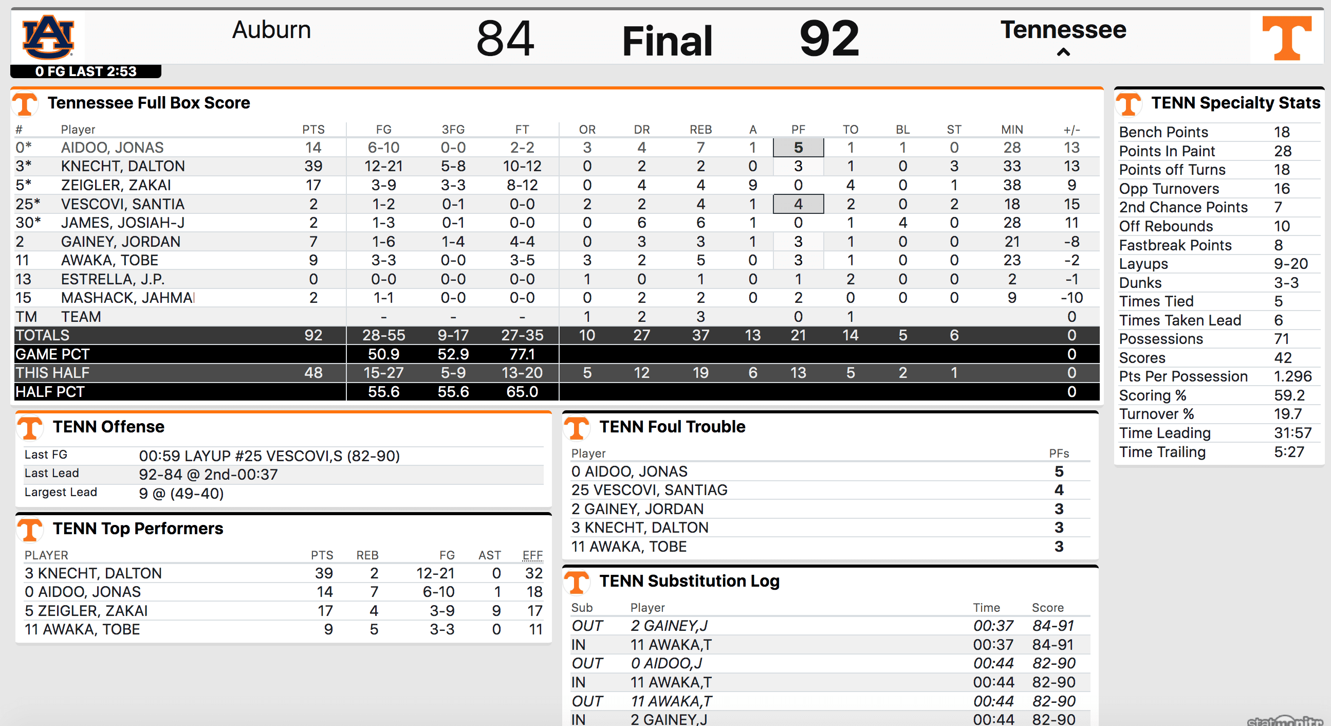 Knecht went nuclear in the game’s final minutes as Tennessee basketball defeated Auburn 92-84 at Thompson-Boling Arena at Food City Center.