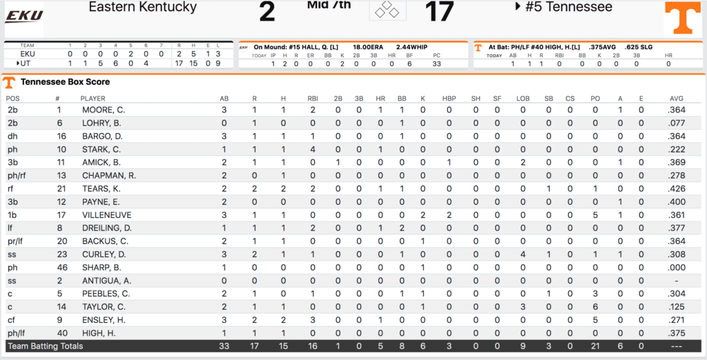 Tennessee was able to empty the bench despite playing just seven innings. Eighteen different Tennessee batters got at-bats and bench bats Charlie Taylor and Hunter High recorded hits.