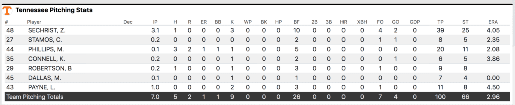 The Vols used seven different pitchers in the game despite Zander Sechrist getting 3.1 innings of action. RHP Brady Robertson made his career debut and retired two of the three batters he faced.