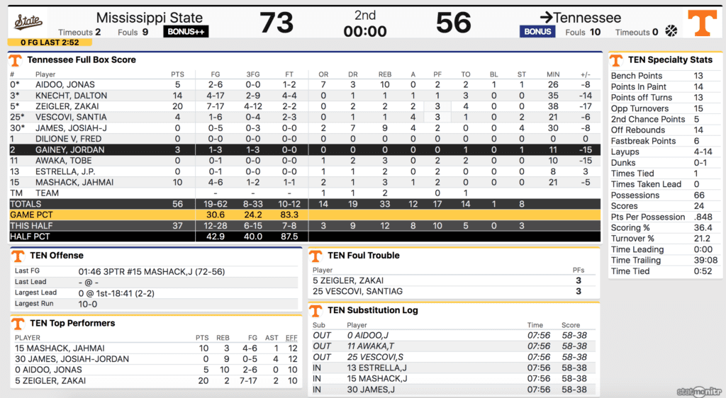 The bad offense continued throughout the first half as Tennessee shot two-of-18 from the three-point line and totaled just 19 points on .576 points per possession. Tennessee’s abysmal offense allowed Mississippi State to open up a massive 38-19 halftime lead. It was the worst half the Vols have played all season.