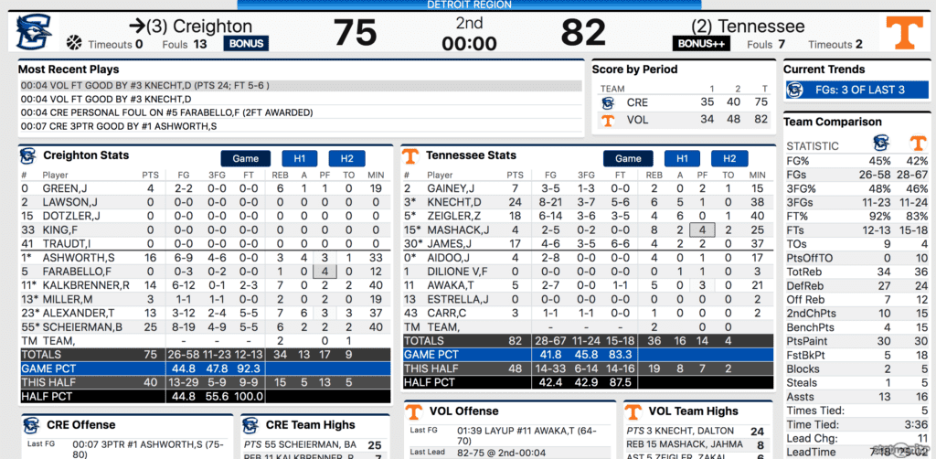 In total, it was an 18-0 run in 4:50 that gave Tennessee a 16 point lead. Creighton didn’t go away and made made runs of its own but the run completely flipped the game.