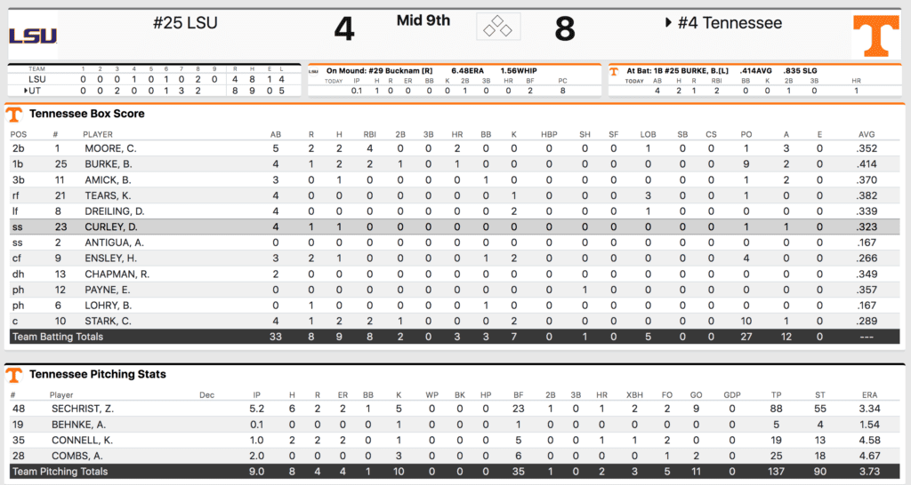 Tennessee’s star second baseman wasn’t done either. He came up with two-on and two-outs in the seventh inning and broke the game open by launching a no doubt homer to left field, tying Burke for the program record in the process.
