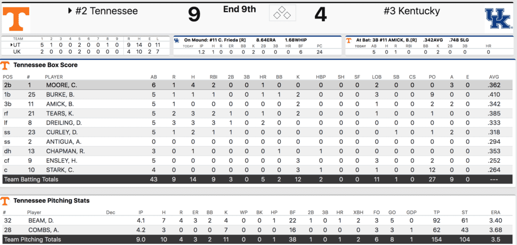 Tennessee had strong offensive production throughout its one through seven hitters against Kentucky so it was hardly a three-man wrecking crew. But Christian Moore, Kavares Tears and Dylan Dreiling all turned in huge games at the plate in the win.