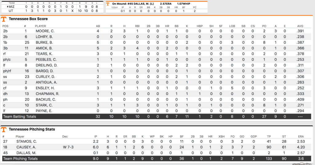 Tennessee entered Thursday night’s matchup against Missouri with the most home runs in the country. They did nothing to slow down their pace, scoring all 10 runs on SIX home runs on Thursday night.
