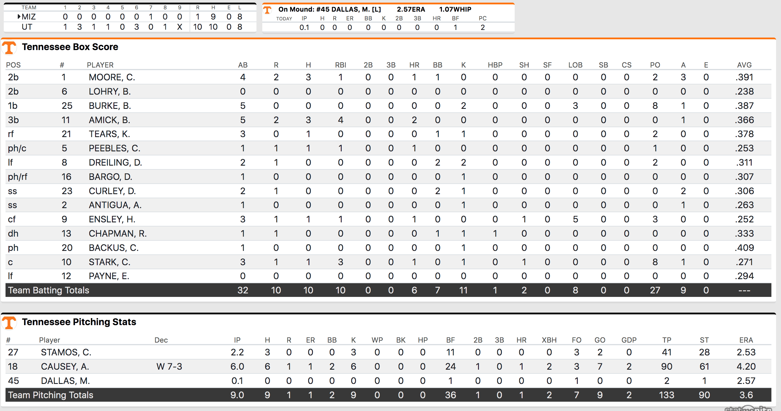 Cal Stark provided the home run that opened the game up in the second inning. After Reese Chapman struck out with runners on second and third with one-out, Stark picked him up launching a 400 foot three-run home run that opened the things up for Tennessee.