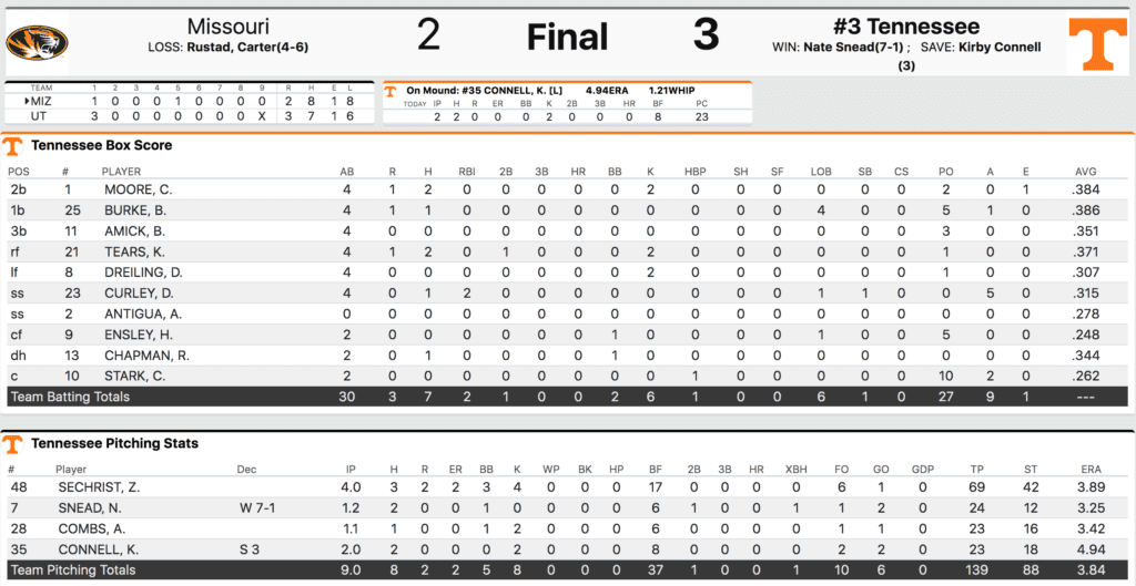 Tennessee scored three runs in the first inning and held on to win thanks to strong pitching and Missouri base running blunders. Here’s everything to know about the win.