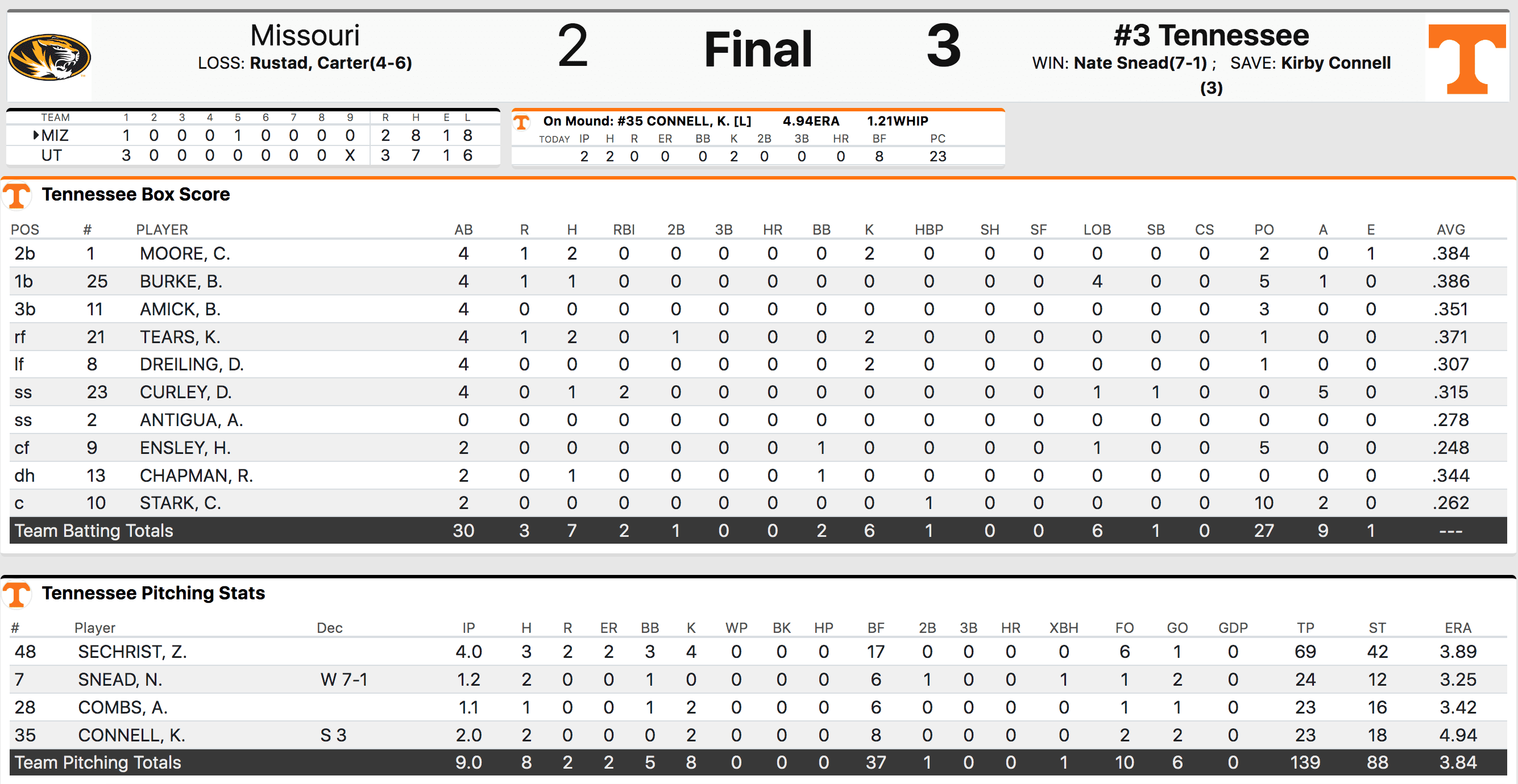 One of those inherited runners scored but Tennessee was able to preserve the lead thanks to some solid defensive plays. Sechrist ended his day allowing three hits, two runs and three walks while striking out four in four innings pitched.