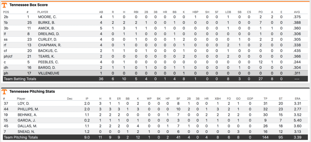 Tennessee scored six runs which wasn’t a minuscule number but was a quiet one for a midweek matchup. The Vols scored four runs in the first two innings but only scratched across two more runs the rest of the game.