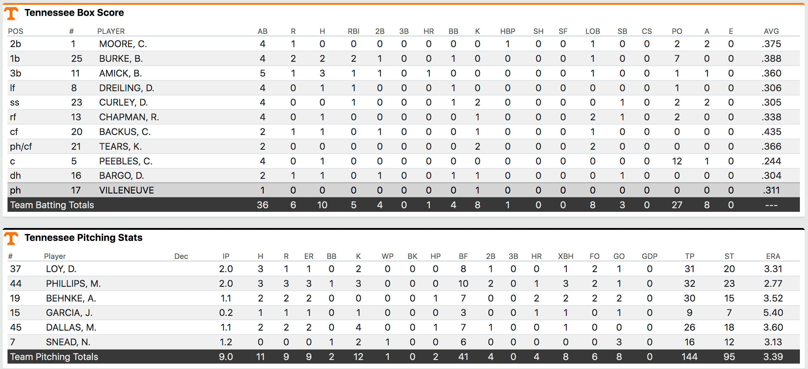 The Vols did have some opportunities for big innings. They loaded the bases with no one out in both the first and the seventh inning but scored just one run each time.