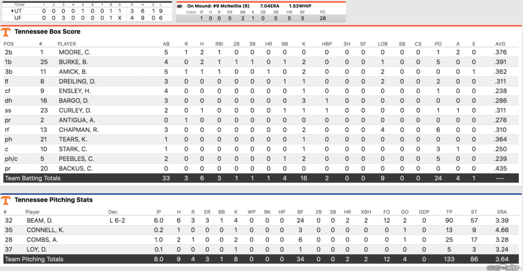 Tennessee’s bats were quiet in the loss spoiling a strong starting pitching performance from Drew Beam. Here’s what to know about the Vols’ game two loss.