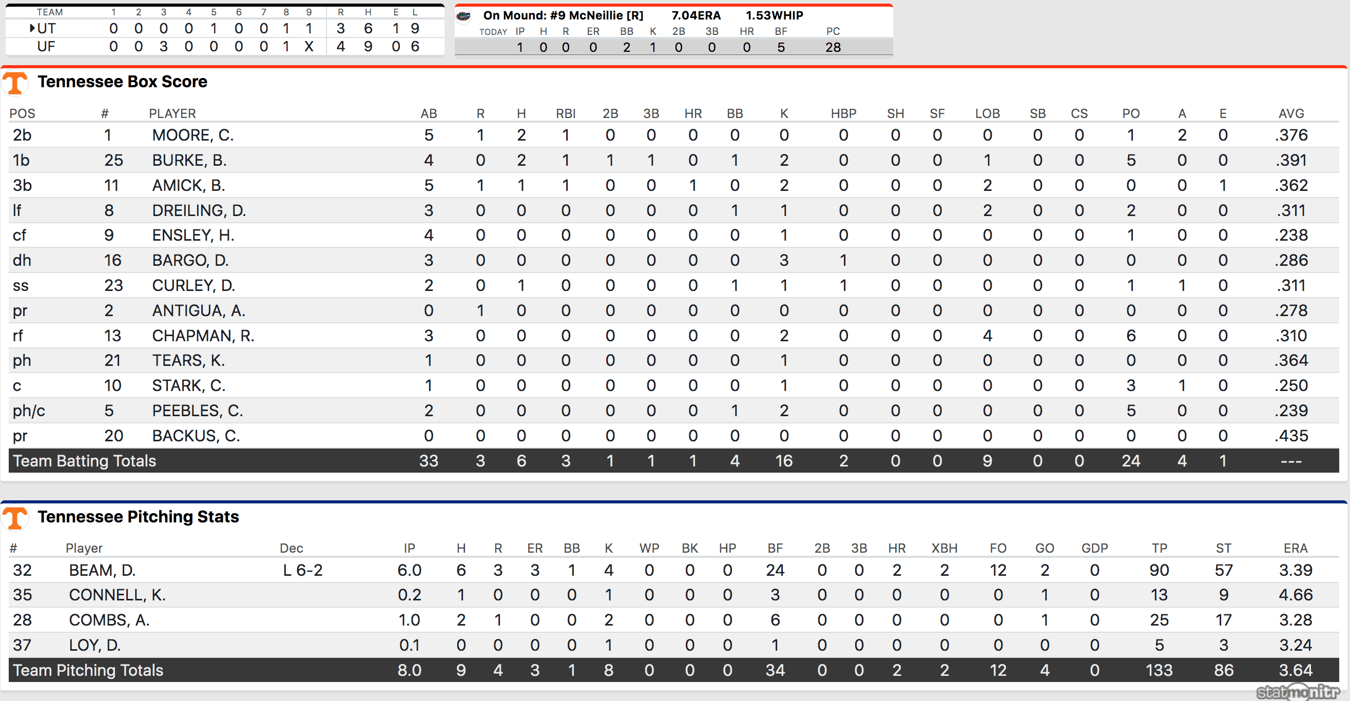A big one came in the first inning. Blake Burke’s one-out triple gave Tennessee a prime scoring opportunity but both Billy Amick and Dylan Dreiling struck out as Florida’s Liam Peterson evaded the first inning threat.