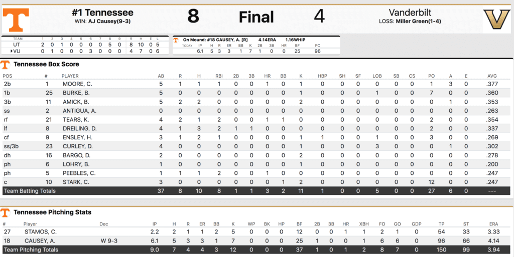 But credit to Causey for the response. He retired Vanderbilt in order in the seventh and eighth inning before working around a two-out single in the ninth inning to secure the win.
