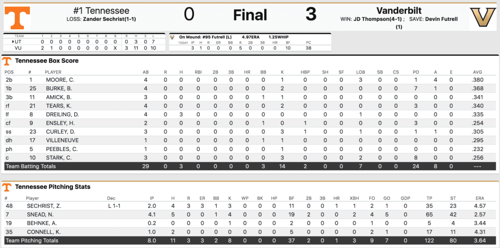 Led by JD Thompson, Vanderbilt’s pitching staff became the first team to shut out Tennessee all season long. Here’s everything to know about the series finale loss.