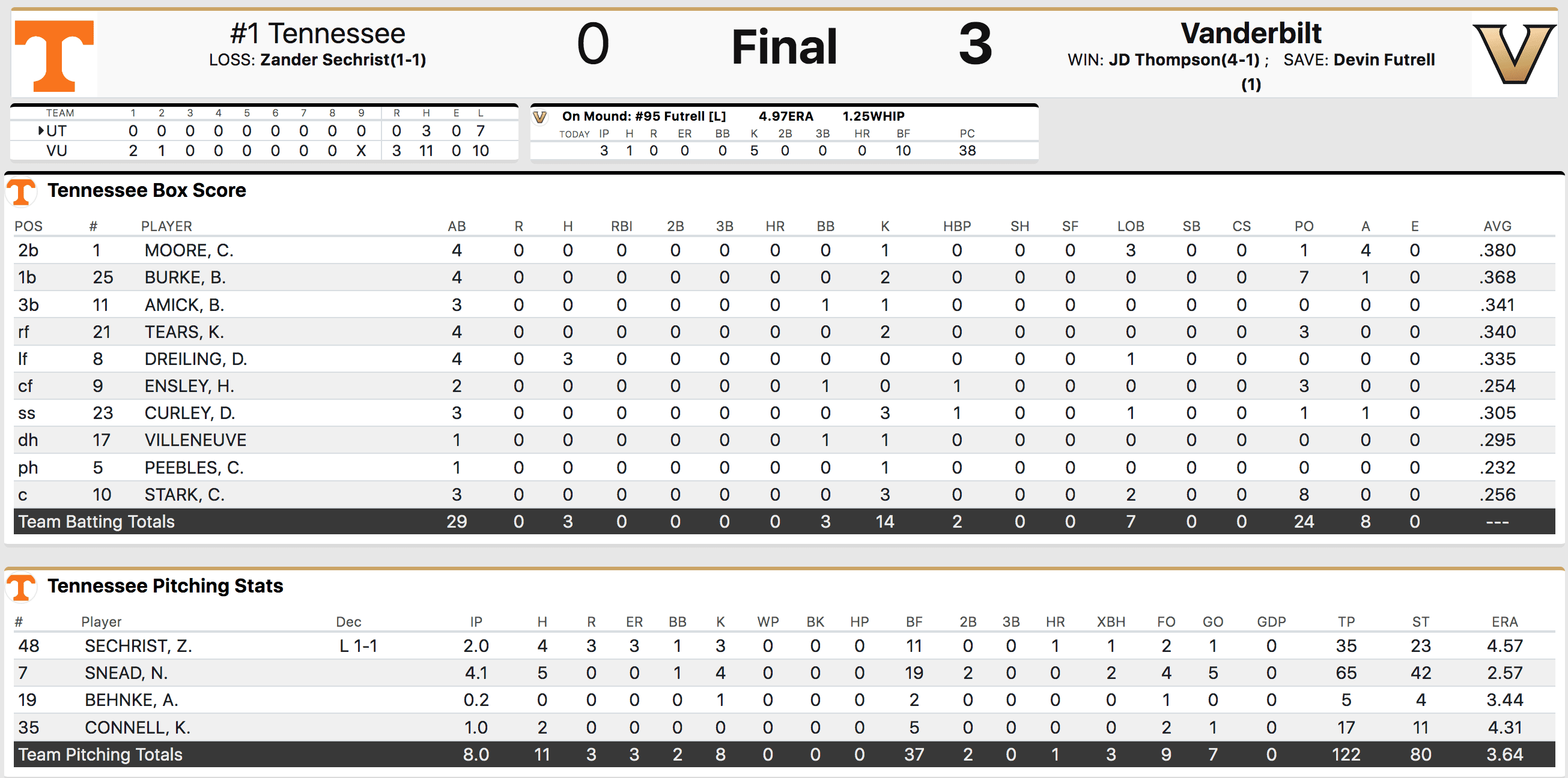 Tennessee went to the bullpen to open the third inning making it a three-run, two inning outing for Sechrist. The lack of offensive production compounded the issue but it was still a poor outing for Sechrist.
