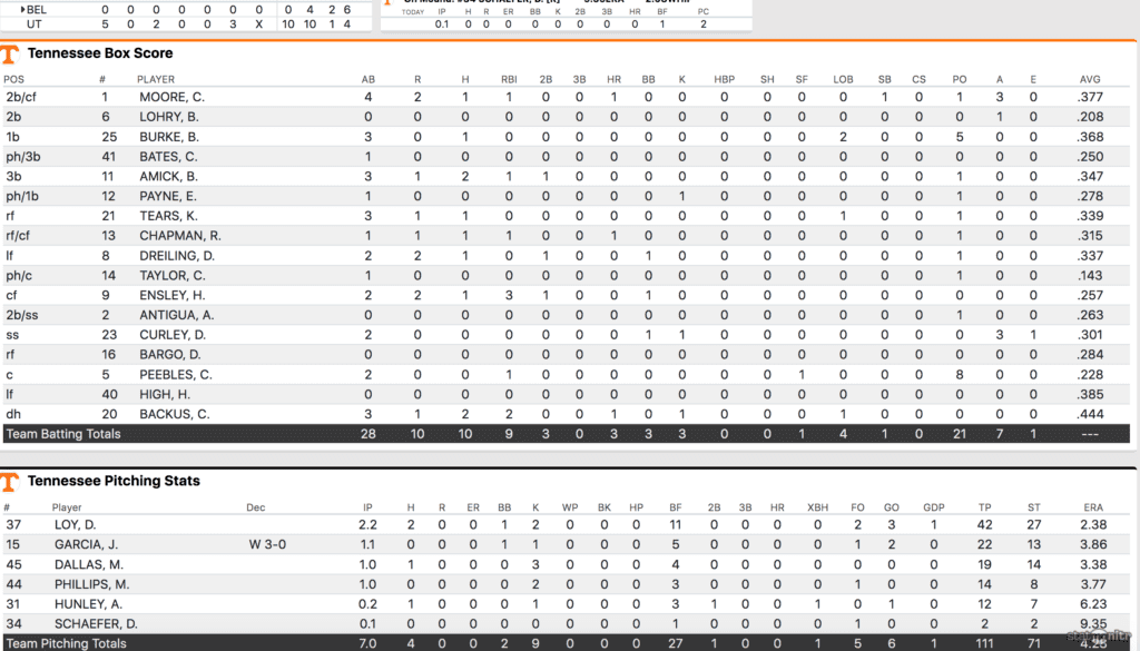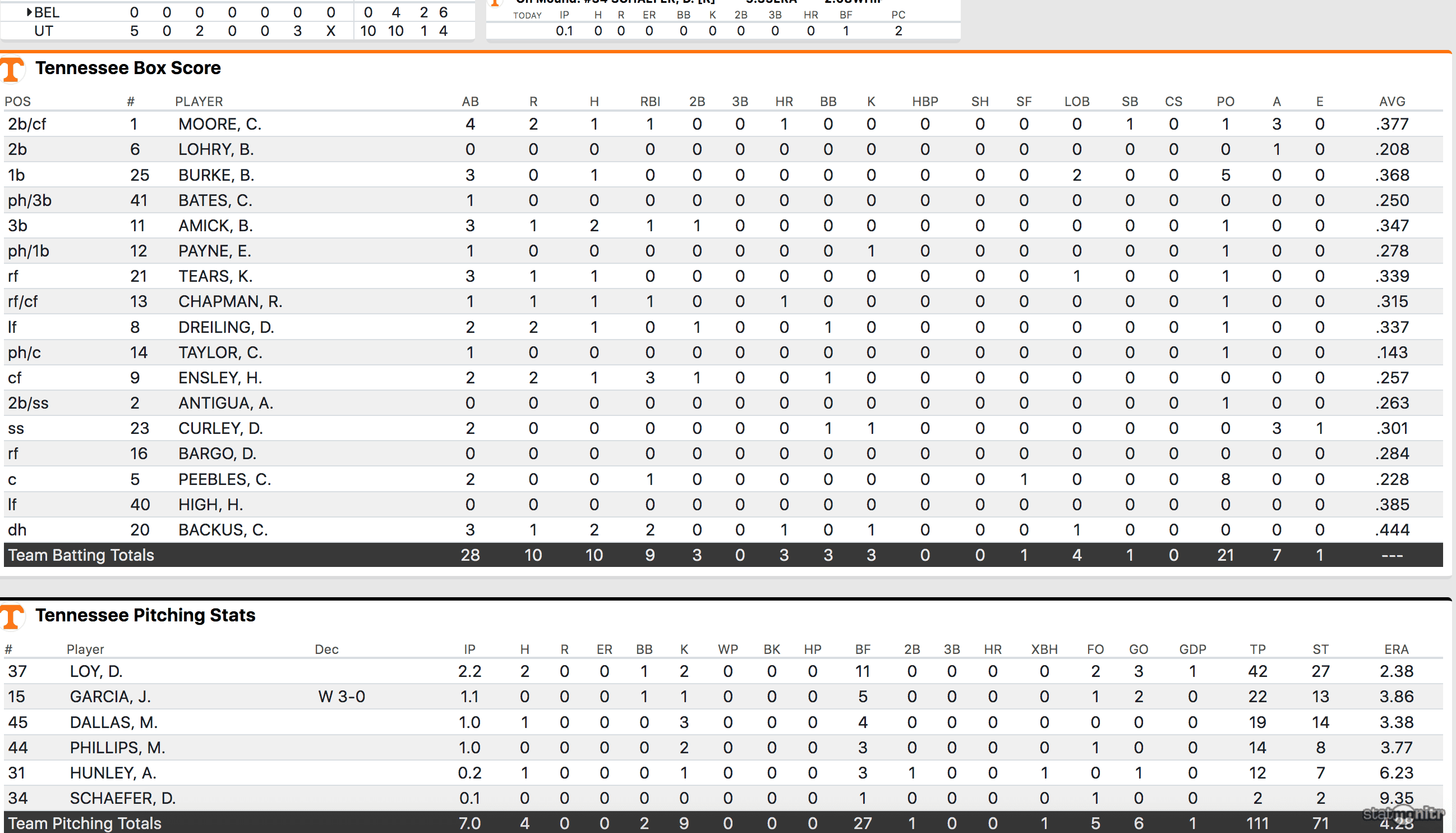 The Vols used six pitchers in the win including Dylan Loy, JJ Garcia, Matthew Phillips, Marcus Phillips, Austin Hunley and Derek Schaefer
