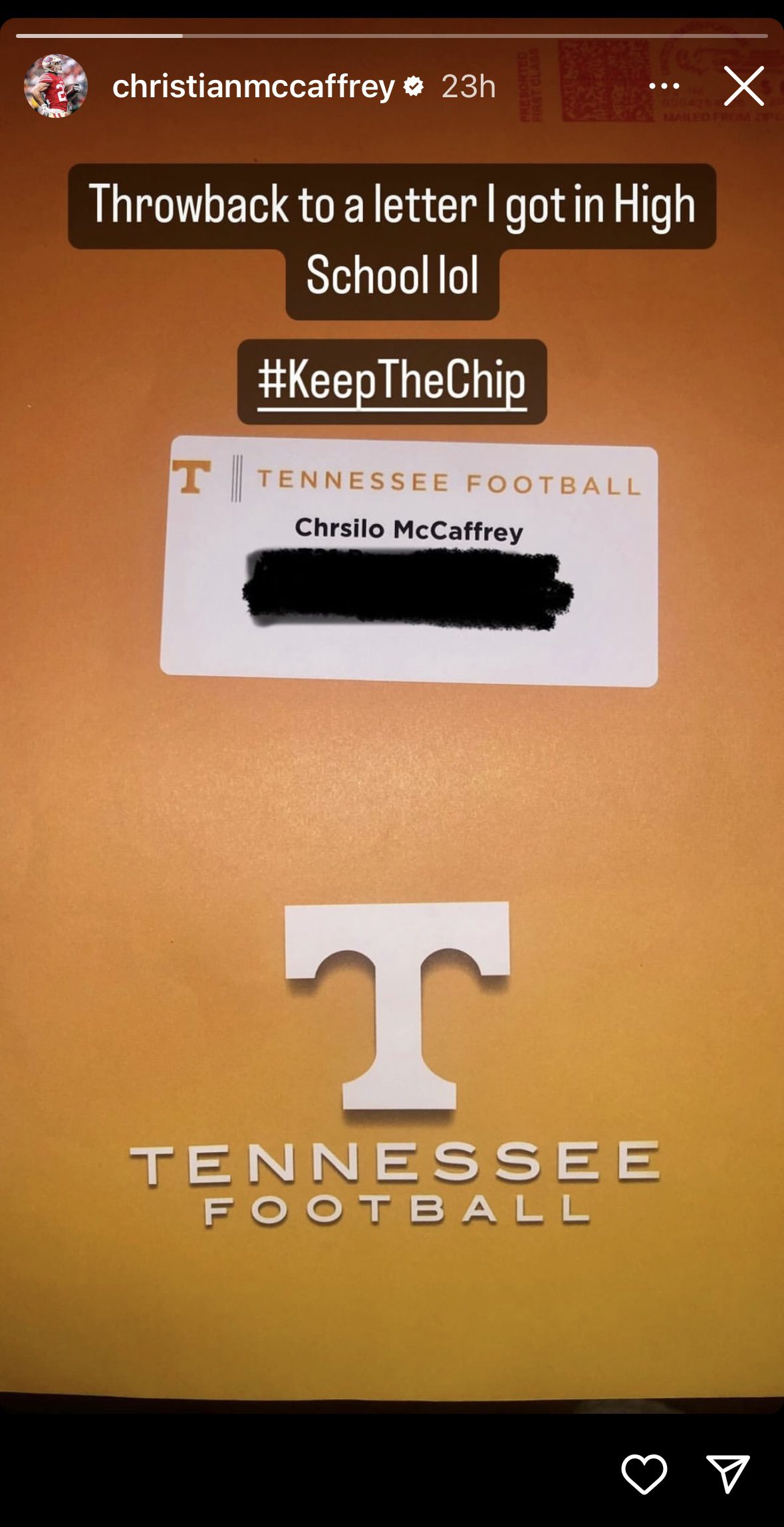 San Francisco 49ers running back Christian McCaffrey posted a picture of a recruiting blunder dating back to his high school days with Tennessee as the culprit.