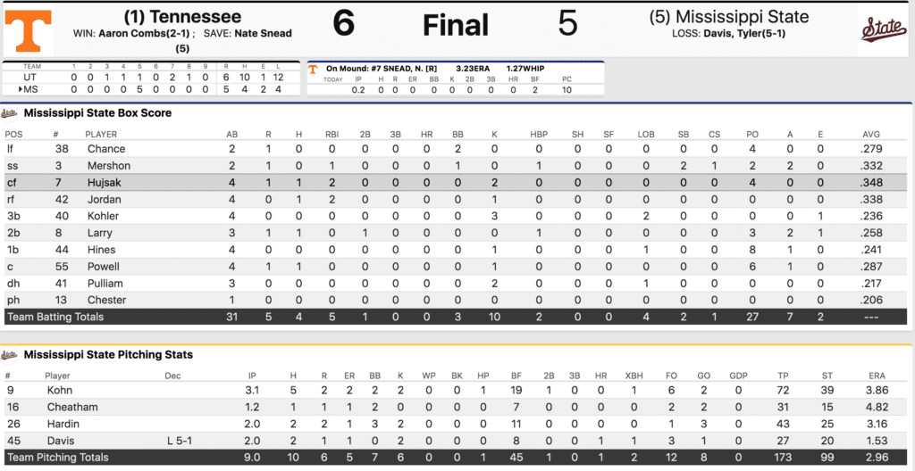Mississippi State starting pitcher Pico Kohn entered the game with just 19 innings pitched on the season. Tennessee did a great job of constantly putting pressure on him early in the game but didn’t do a great job of fully capitalizing on that pressure.