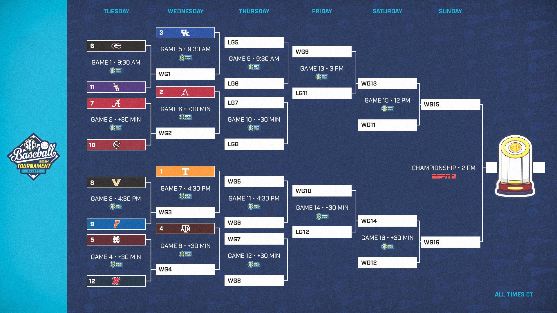 Two quarterfinal games will take place on Friday before the semifinal round on Saturday. Three-seed Kentucky will take on 10-seed South Carolina in an elimination game at 4:00 p.m. ET on Friday for the right to play LSU in the semifinals. One-seed Tennessee will also play five-seed Mississippi State in an elimination game on Friday night for the right to play Vanderbilt on Saturday afternoon. The winners of both contests will meet in the SEC Tournament championship game on Sunday at 3:00 p.m. ET from the Hoover Met.