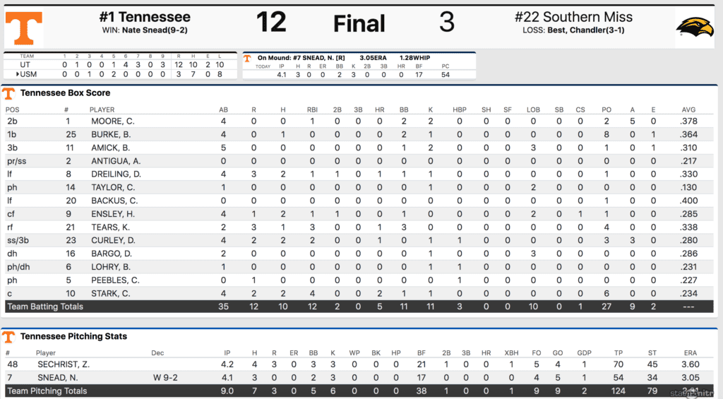 As Southern Miss was running out of pitching, Tennessee was turning to one of its best pitchers. Nate Snead hadn’t thrown all weekend and he came into the game ready to eat outs. That’s exactly what he did.