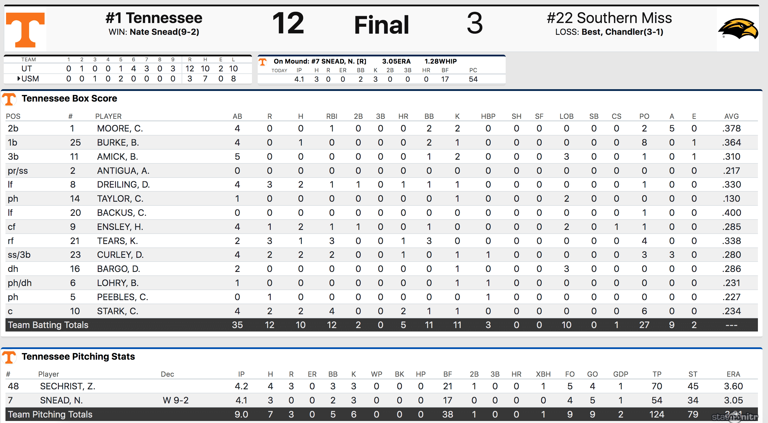 As Southern Miss was running out of pitching, Tennessee was turning to one of its best pitchers. Nate Snead hadn’t thrown all weekend and he came into the game ready to eat outs. That’s exactly what he did.