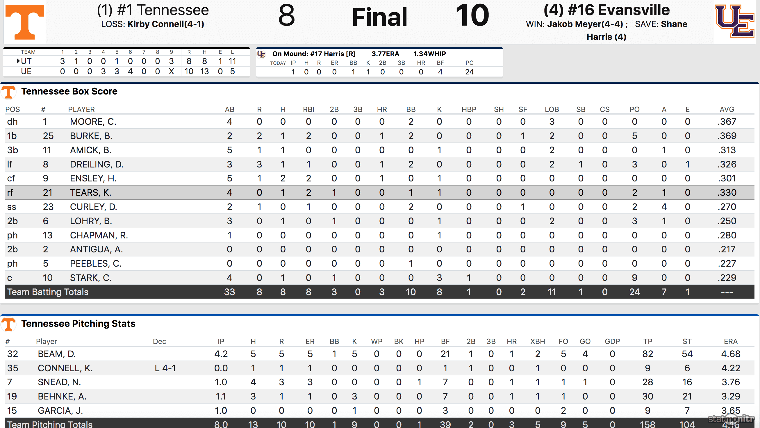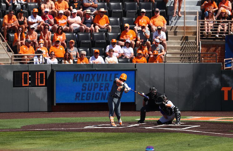 Evansville scored 10 runs in three innings to turn a four-run deficit into a five-run lead. Tennessee made a ninth inning push but it wasn’t enough as the Purple Aces earned a 10-8 victory to force a decisive third game.
