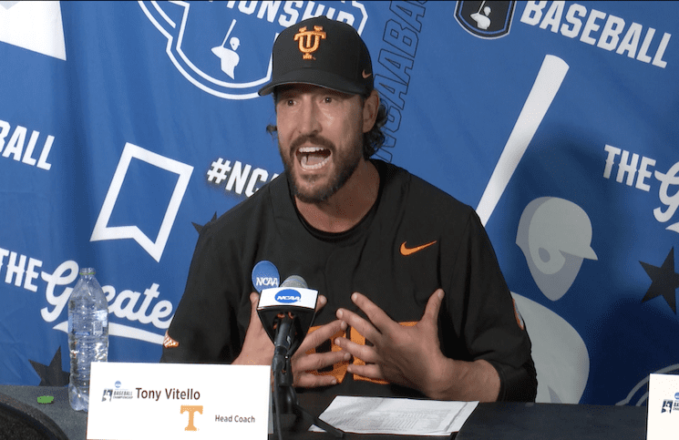 Tennessee baseball head coach Tony Vitello delivered a highly passionate opening statement to begin his press conference following the Vols’ 12-1 Super Regional Final win over Evansville Sunday night in Lindsey Nelson Stadium.