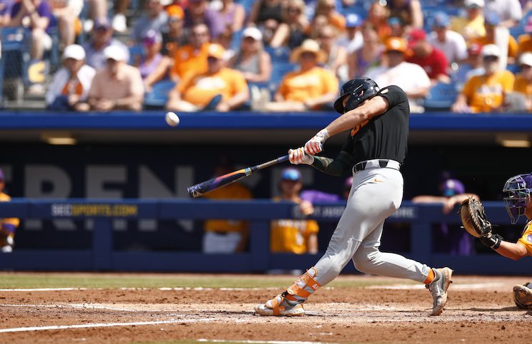 Clemson transfer Billy Amick hits a home run against LSU in the SEC Tournament // Photo via UT Athletics Kate Luffman