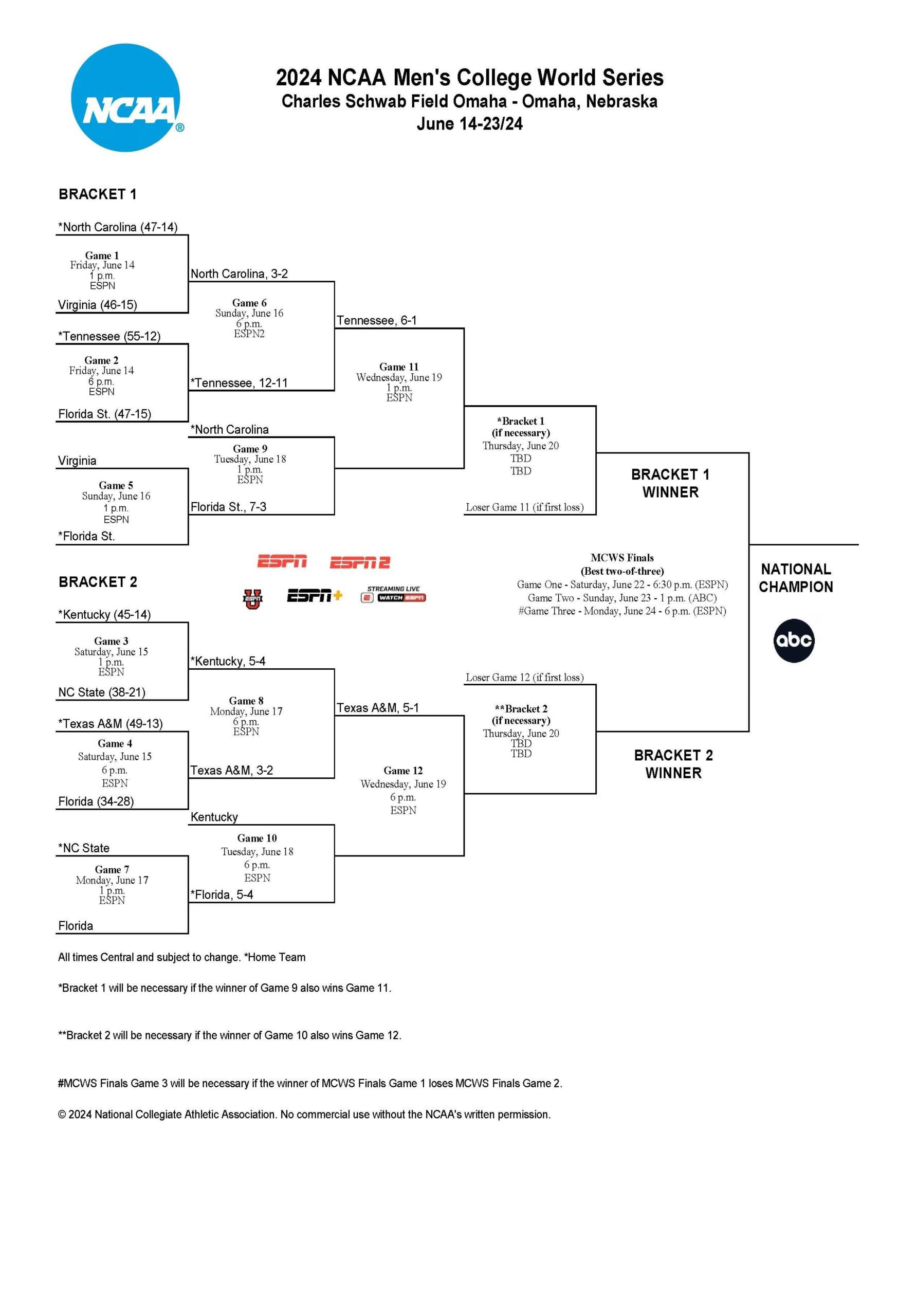 North Carolina and Florida State will square off in an elimination game on Tuesday afternoon, as will Kentucky and Florida on Tuesday night. The winners of each game will go on to face Tennessee and Texas A&M respectively as the final four teams left standing. The Vols and Aggies are one win away from the College World Series finals but could be pushed to a second game if either loses their first game in the semifinals on Wednesday.