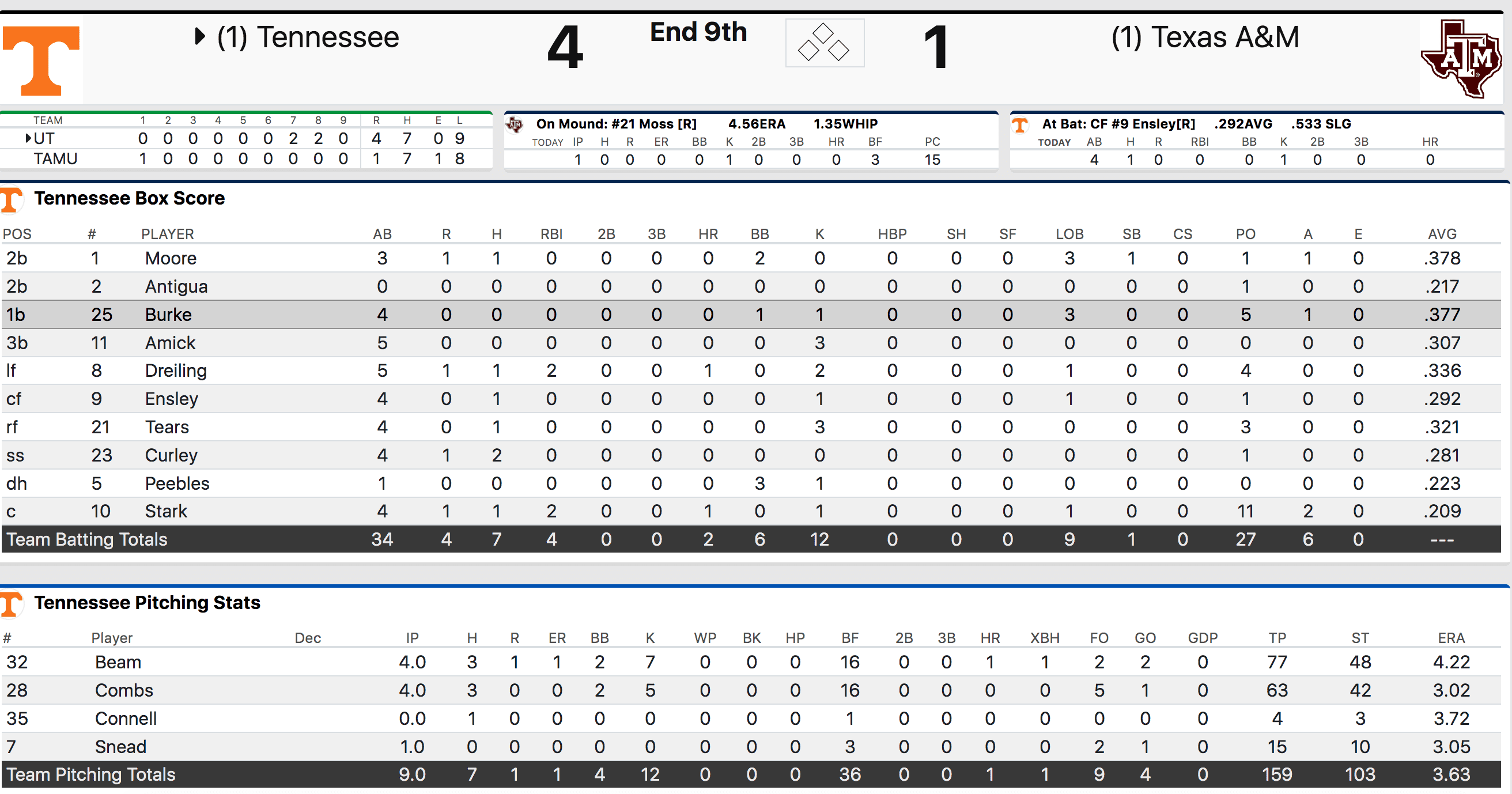 The story continued as it had throughout the game. Burke hit a fly out deep enough to center that Moore could tag up to second on but then Billy Amick flew out and there were quickly two outs as Tennessee searched for its first hit with runners on base.
