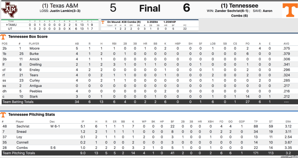 In an inning that looked like Texas A&M might tie the game, Tennessee ended up expanding its lead to five runs.