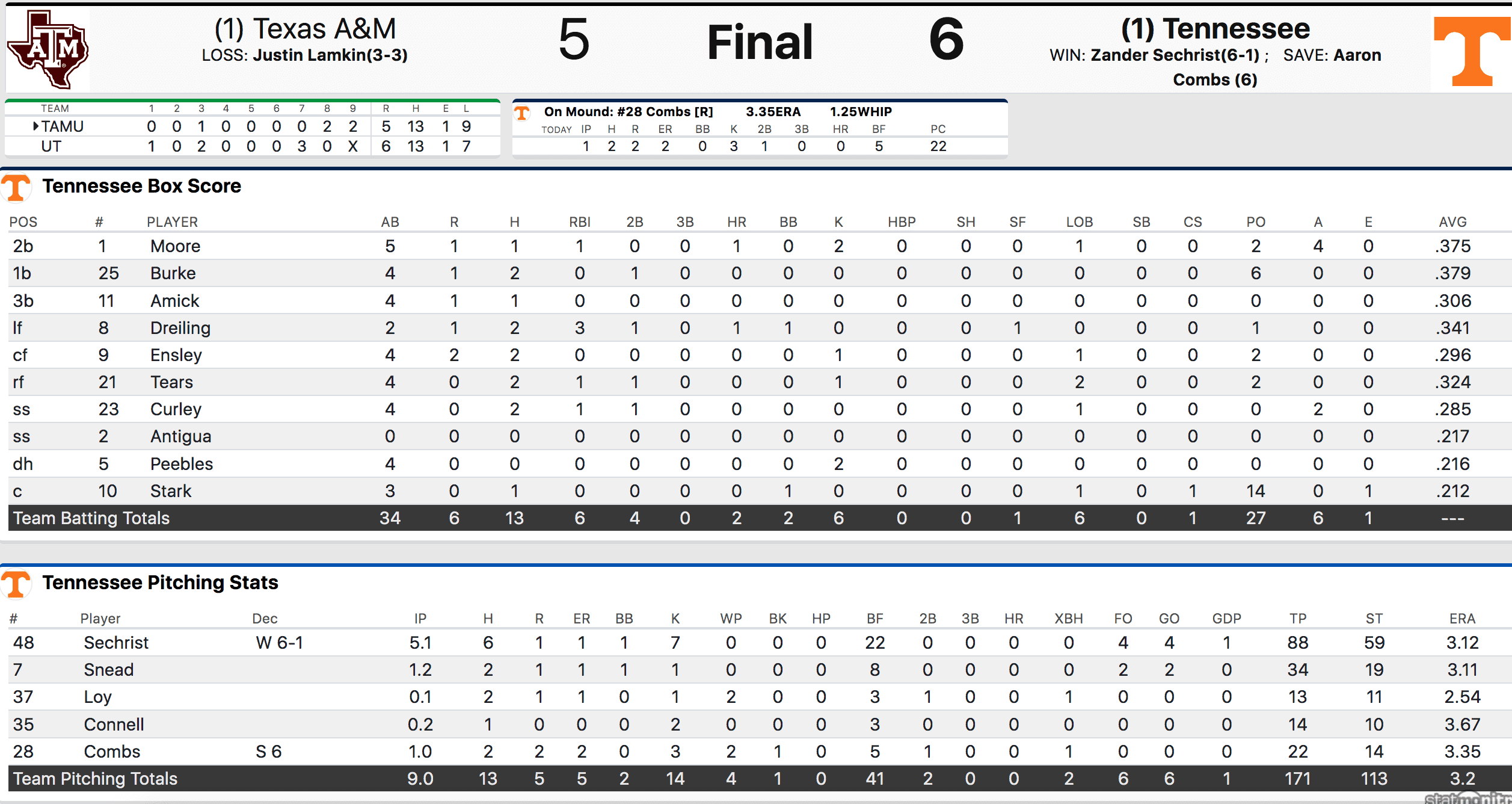 Then Texas A&M’s top reliever Evan Aschenbeck retired Moore and Burke on two pitches to start the inning. But that’s when Tennessee got going.