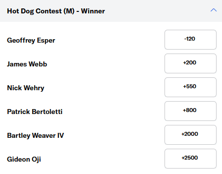 BetMGM has odds for both the men’s and women’s side of the Hot Dog Eating Contest, with Geoffrey Esper a -120 favorite for the men’s contest, and multiple-time women’s champ Miki Sudo a heavy -1600 favorite.