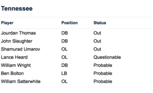 Tennessee Availability Report (Thursday Updated 8:10 p.m. ET)