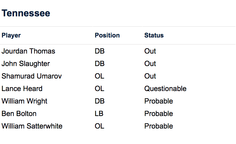 Tennessee released their inaugural injury report on Wednesday with three players out, one questionable, and three probable.