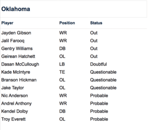 Oklahoma’s availability report is also the same from Wednesday night with four players out, one doubtful, three questionable, and four probable.