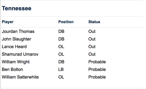The Vols are thin on the offensive line, especially at offensive tackle, and starting right tackle John Campbell Jr. has yet to play a full game this season. Heard missed last week’s game against Kent State. Expect super senior Dayne Davis to start in his place.
