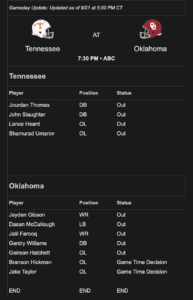 NORMAN, OK — No. 6 Tennessee will be without four injured players against No. 15 Oklahoma on Saturday night.