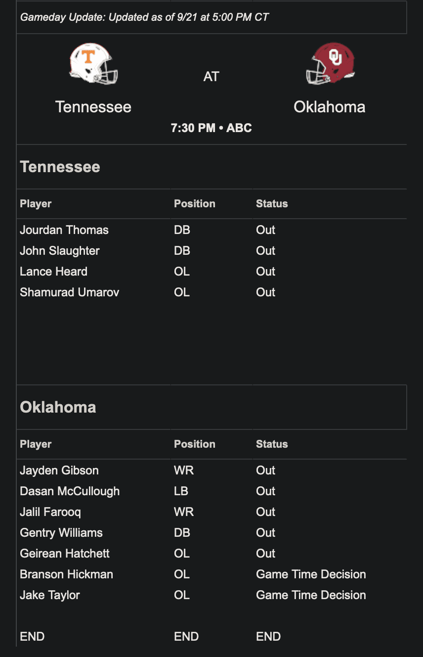 Oklahoma also released their injury report on Saturday evening with five players out and two as a game-time decision: